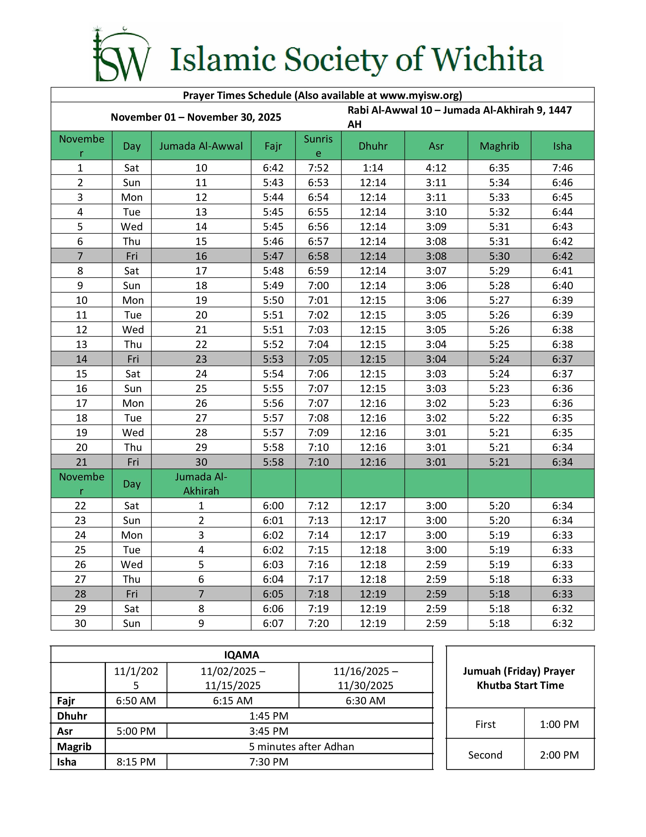 ISW PRAYER TIMINGS